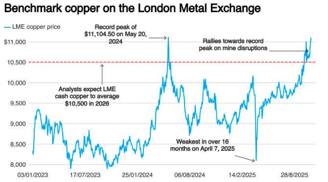 业内30位分析师的预测中值显示,2026年LME现货铜均价料为10500美元/吨,较7月份上次调查的9796美元预测上调了7.2%。