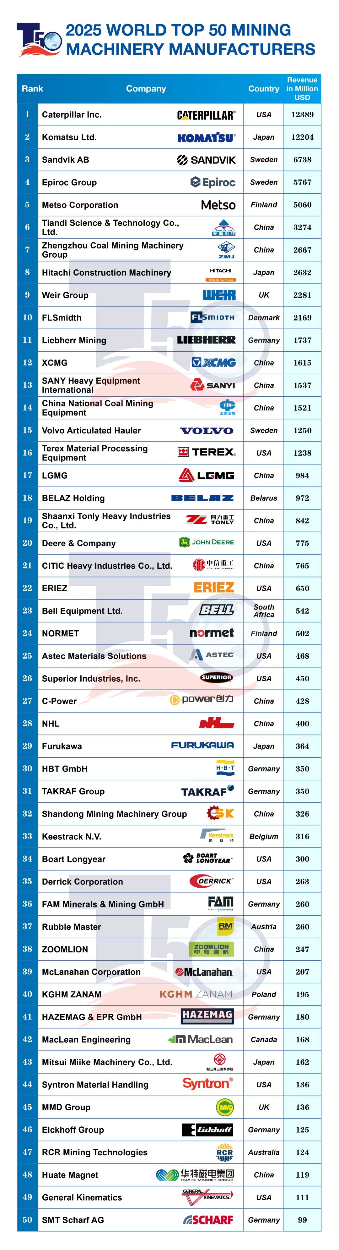 此次榜单的发布,不仅客观反映了当前全球矿业装备制造业的竞争态势,也为行业未来发展指明了方向。在全球化与数字化双轮驱动下,矿业装备制造业将迎来更加激烈的竞争与更深层次的产业变革。