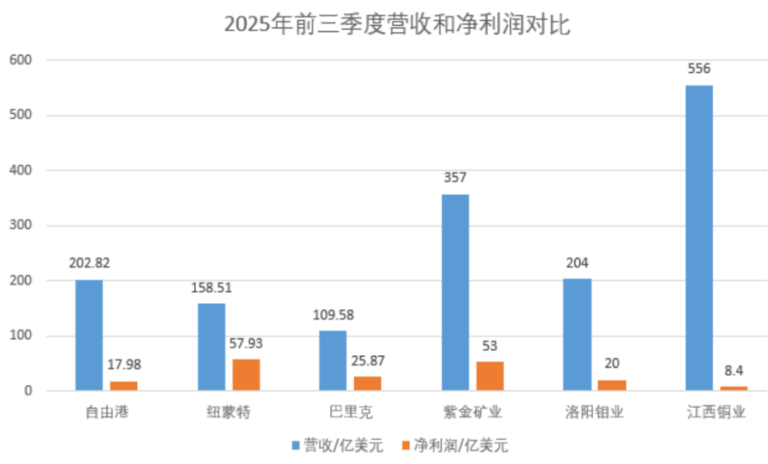 国际矿业巨头,全球最大金矿商纽蒙特(Newmont) 2025年前三季度季度销售额158.51亿美元,季度归属公司股东的净利润57.93亿美元;巴里克公司 2025年前三季度季度销售额109.58亿美元,季度归属公司股东的净利润25.87亿美元;美国自由港迈克墨伦铜金矿(Freeport-McMoRan Inc.) 2025年前三季度营收202.82亿美元,季度归属普通股东的净利润17.98亿美元。