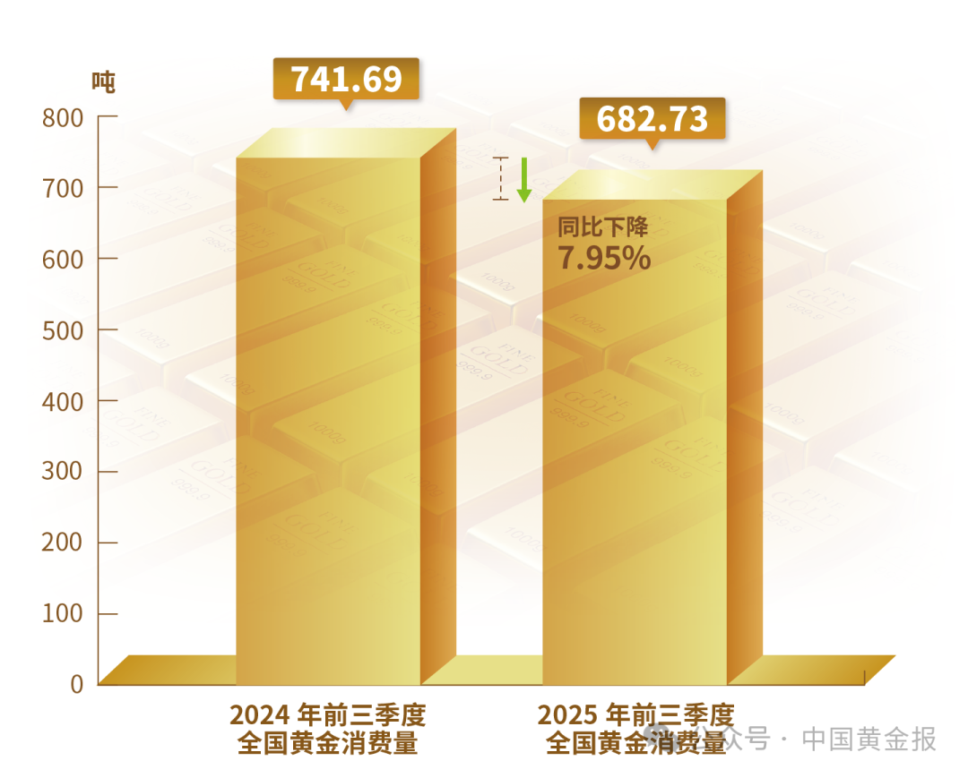 2025年前三季度,我国大型黄金集团境外矿山实现矿产金产量61.439吨,同比增长18.39%。 黄金消费 2025年前三季度,我国黄金消费量682.73吨,同比下降7.95%。其中:黄金首饰270.036吨,同比下降32.50%;金条及金币352.116吨,同比增长24.55%;工业及其他用金60.578吨,同比增长2.72%。