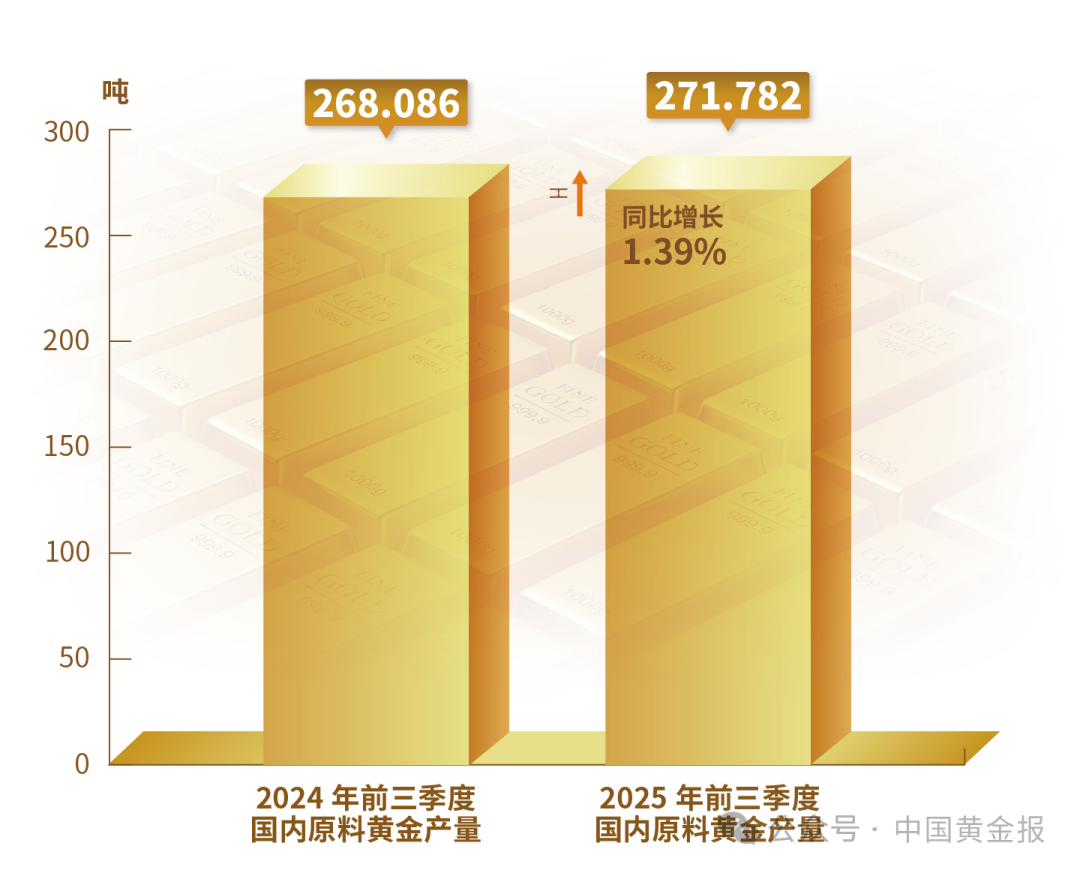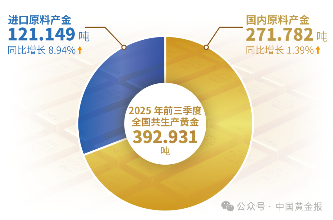 黄金生产 据中国黄金协会最新统计数据显示:2025年前三季度,国内原料产金271.782吨,比2024年同期增加3.714吨,同比增长1.39%。另有进口原料产金121.149吨,同比增长8.94%。国内原料和进口原料共计生产黄金392.931吨,同比增长3.6%。
