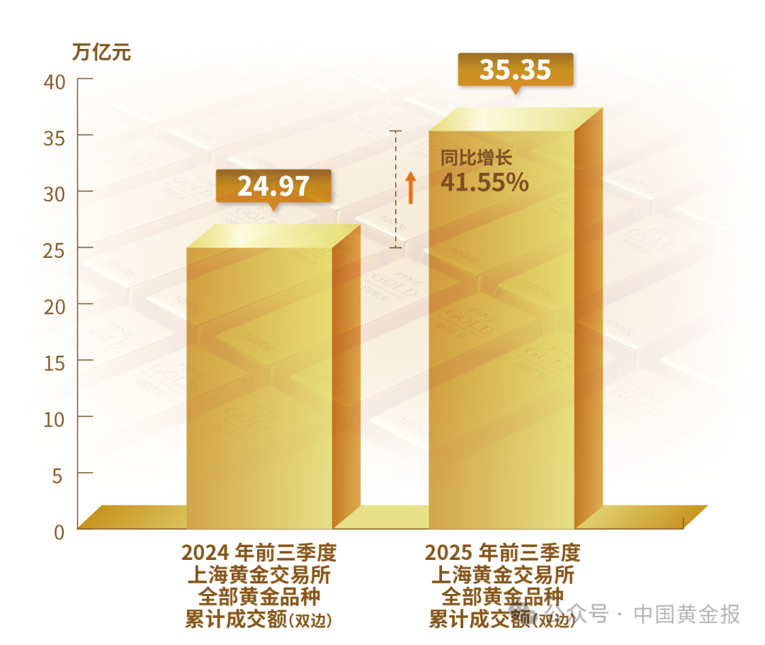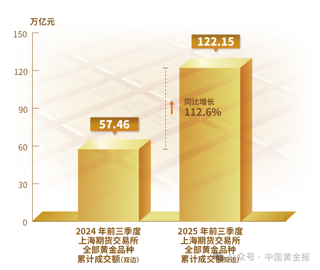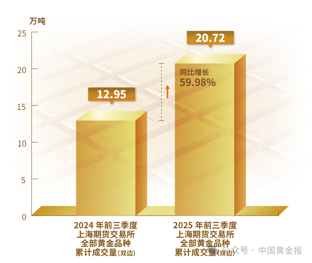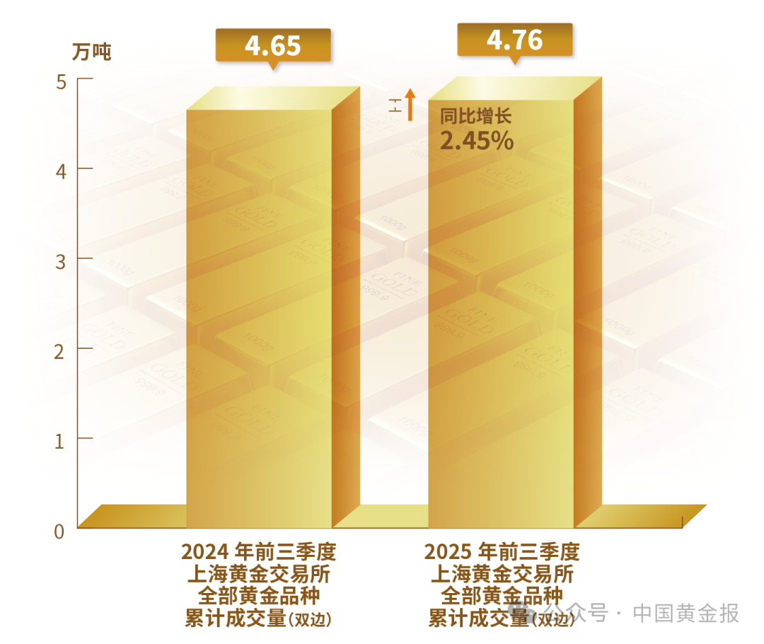 不同品类黄金产品的表现差异明显。轻克重、附加值高的首饰产品仍保持较强市场吸引力,销售情况较好。金条需求仍然旺盛,地缘冲突加剧与经济不确定性使得黄金避险保值的功能进一步凸显。电子、新能源等产业的快速发展使得工业用金需求稳步回升。 黄金市场 2025年前三季度,上海黄金交易所全部黄金品种累计成交量单边2.38万吨(双边4.76万吨),同比上升2.45%;累计成交额单边17.68万亿元(双边35.35万亿元),同比上升41.55%。上海期货交易所全部黄金期货期权累计成交量单边10.36万吨(双边20.72万吨),同比上升59.98%;累计成交额单边61.08万亿元(双边122.15万亿元),同比上升112.6%。