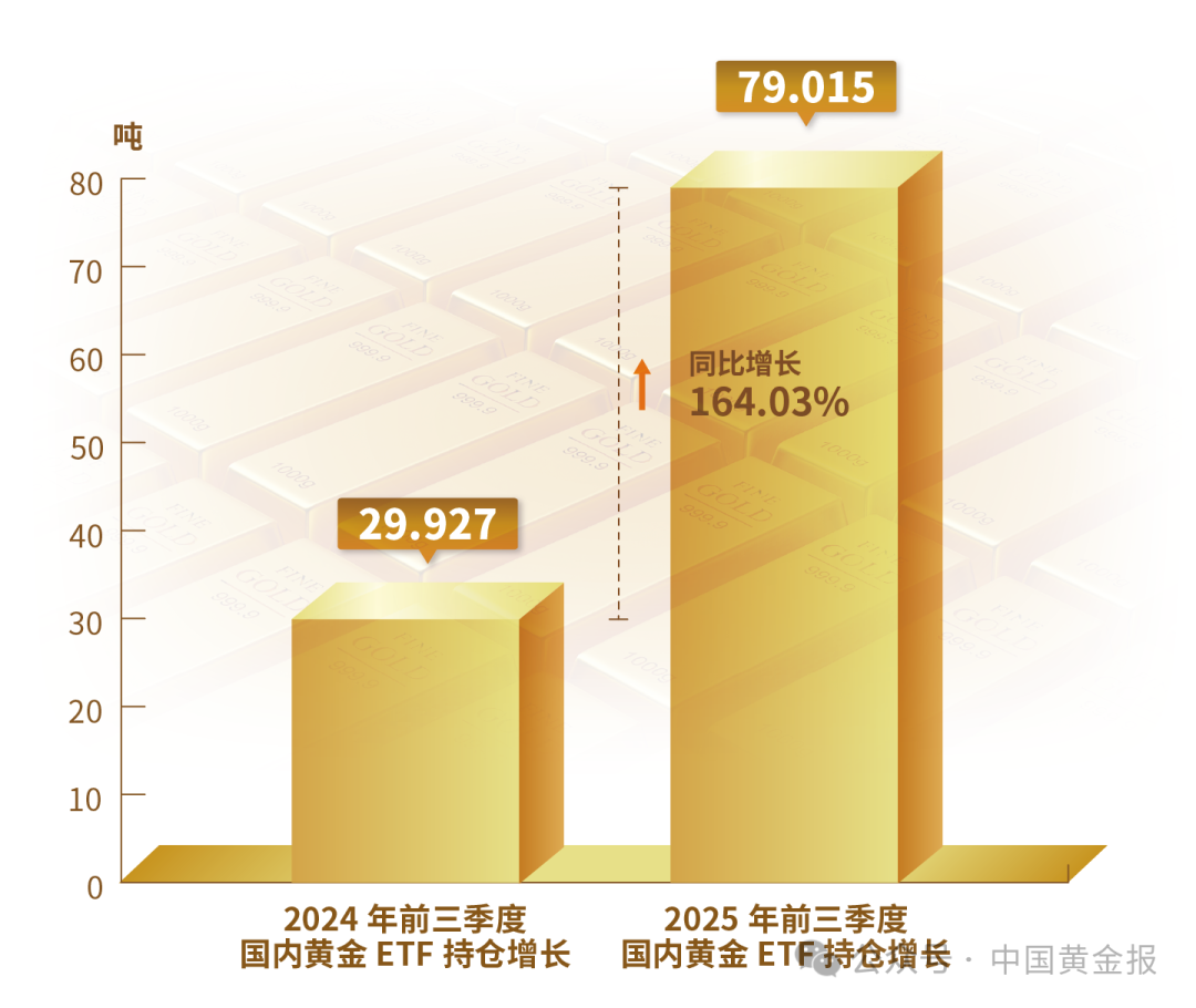 2025年前三季度,国内黄金ETF增仓量为79.015吨,较2024年前三季度增仓量29.927吨,同比增长164.03%。至9月底,国内黄金ETF持仓量为193.749吨。
