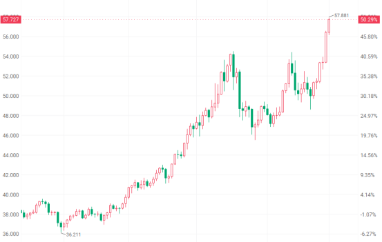 白银市场表现强劲,Wind数据显示,12月1日,国际银价一度突破57美元/盎司关口,再创新高;COMEX白银首次突破58美元/盎司;沪银主力合约盘中最高涨超7%,达13520元/千克,创下新高。今年以来,国际银价已上涨超90%,大幅跑赢黄金。