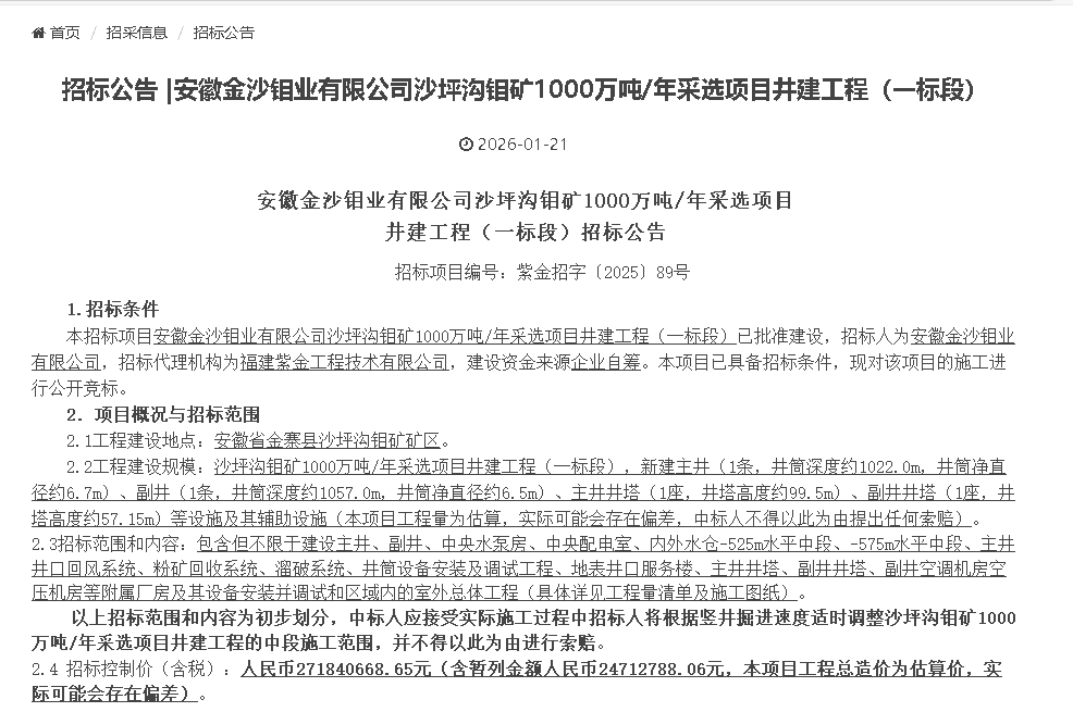 股权合作敲定仅两日,1月21日,沙坪沟钼矿便迎来实质建设关键动作——安徽金沙钼业有限公司发布沙坪沟钼矿1000万吨/年采选项目井建工程(一标段)招标公告(项目编号:紫金招字〔2025〕89号),由福建紫金工程技术有限公司担任招标代理,标志着项目从审批阶段正式转入工程实施环节,资源变现时间表进一步清晰。本次招标聚焦井下核心设施建设,招标控制价(含税)约2.72亿元,涵盖主副井、井塔及配套系统,是300亿总投资项目落地的重要开篇。
