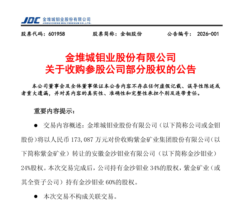 2026年1月,安徽金寨沙坪沟钼矿迎来两大关键节点:本月19日,紫金矿业以17.3亿元转让项目24%股权给金钼股份,达成强强联合开发共识。