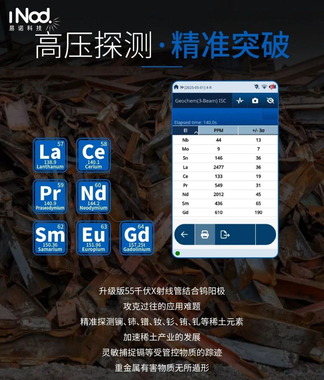 2. 微量探测能力,捕捉ppm级信号针对稀土元素低含量特性,VANTA可检测低至两位数ppm水平的稀土金属,完美覆盖0.05%-40%的稀土氧化物检测范围,与传统ICP-OES法的检测下限持平。在纳米比亚Lofdal重稀土项目中,该设备通过检测磷钇矿石中的钇元素,精准预判重稀土富集区域,为勘探决策提供可靠依据。