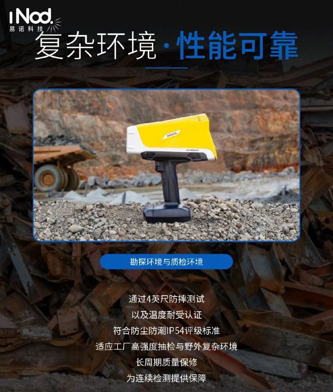 - 回收阶段:快速筛查废旧磁钢、电子元件中的稀土成分,助力“城市矿山”资源激活,适配从镁到铀的全元素分析范围。同时,设备具备IP55防尘防水等级与1.2米防坠落能力,能轻松应对矿区高温、多尘、潮湿的恶劣环境,单次充电可完成1000次以上检测,适配野外徒步勘探与多钻机同步作业场景。