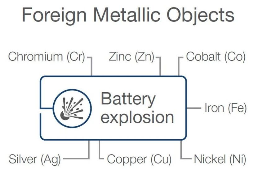 如果在制造过程中意外引入异金属,锂离子电池可能会爆炸