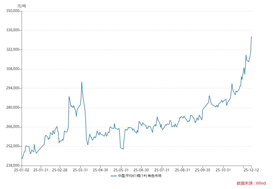12月12日,国内现货锡价在突破每吨33万元整数关口后继续上行,Wind数据显示,锡(1#)当日报价达331,640元/吨,单日上涨10,870元,年内累计涨幅约37%,价格攀升至2022年6月以来的最高位。同期,沪锡期货主力合约亦大幅收高,市场看涨情绪显著。