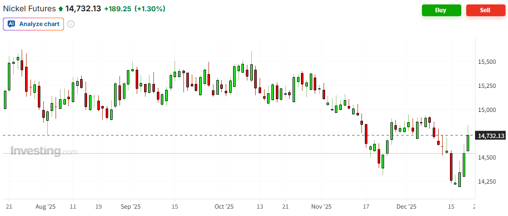 周五(12月19日)欧洲时段,伦敦金属交易所(LME)期镍价格涨约1.3%,报每吨14732美元。周三时,镍价一度跌破14200美元,创今年4月以来的最低水平。